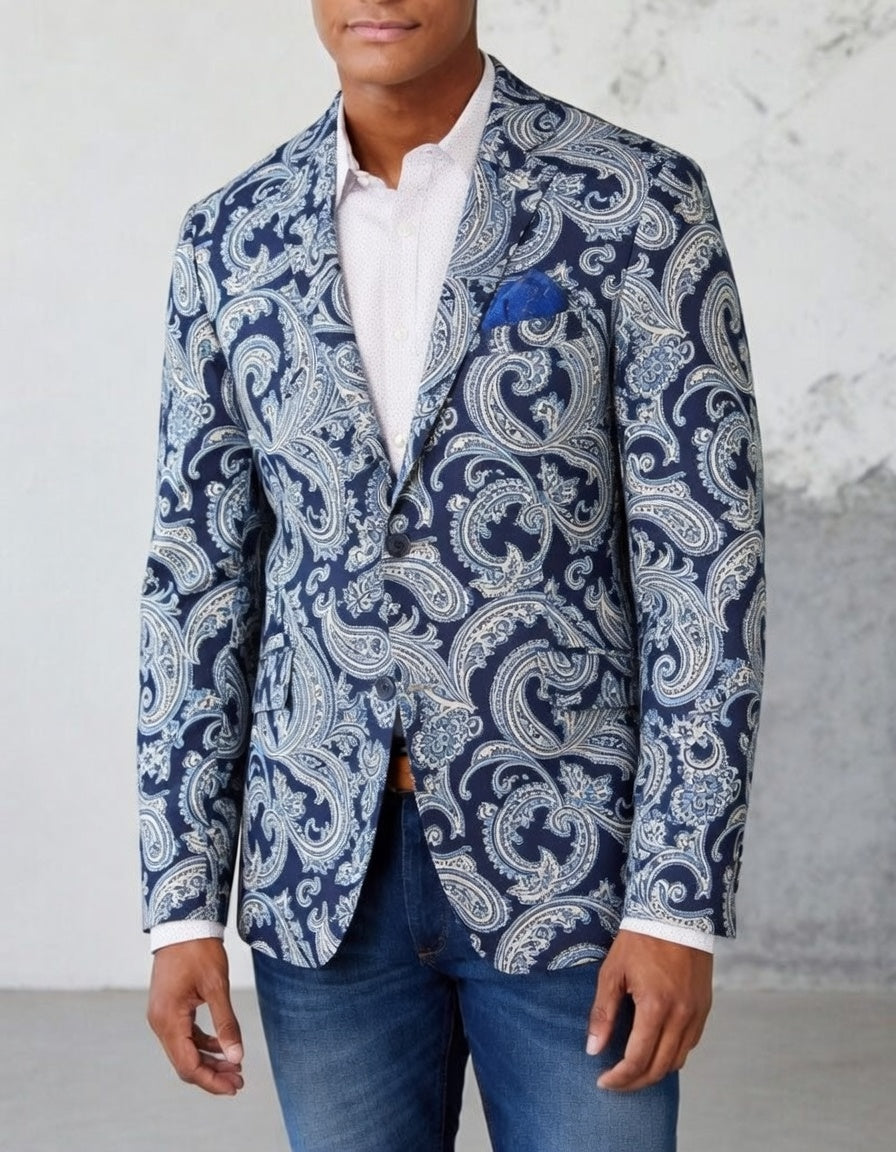 This striking navy paisley blazer features an intricate white and cream swirling pattern that adds rich visual interest and modern flair. With its tailored slim fit, structured shoulders, and refined notch lapels, this versatile sport coat delivers a polished, confident look for both business casual and smart social occasions.