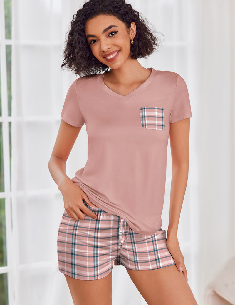 • FEATURES: pajama sets for women 2 piece, pj sets for woman, V neck women's pajama sets, short sleeve T-shirt, drawstring elastic waist shorts.
