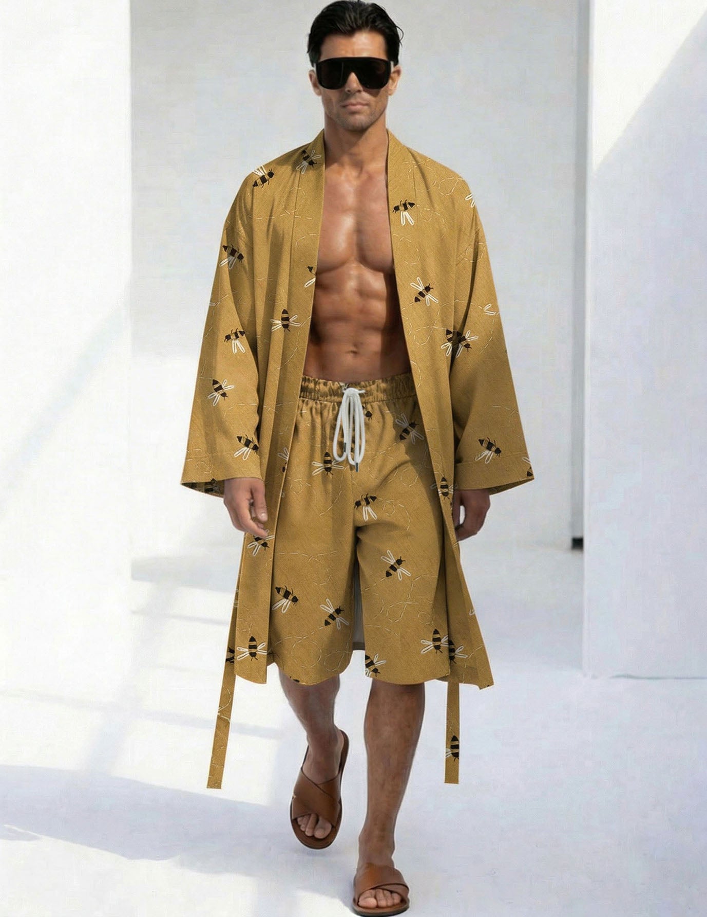 Luxurious Bee Print Robe and Shorts Set for Men