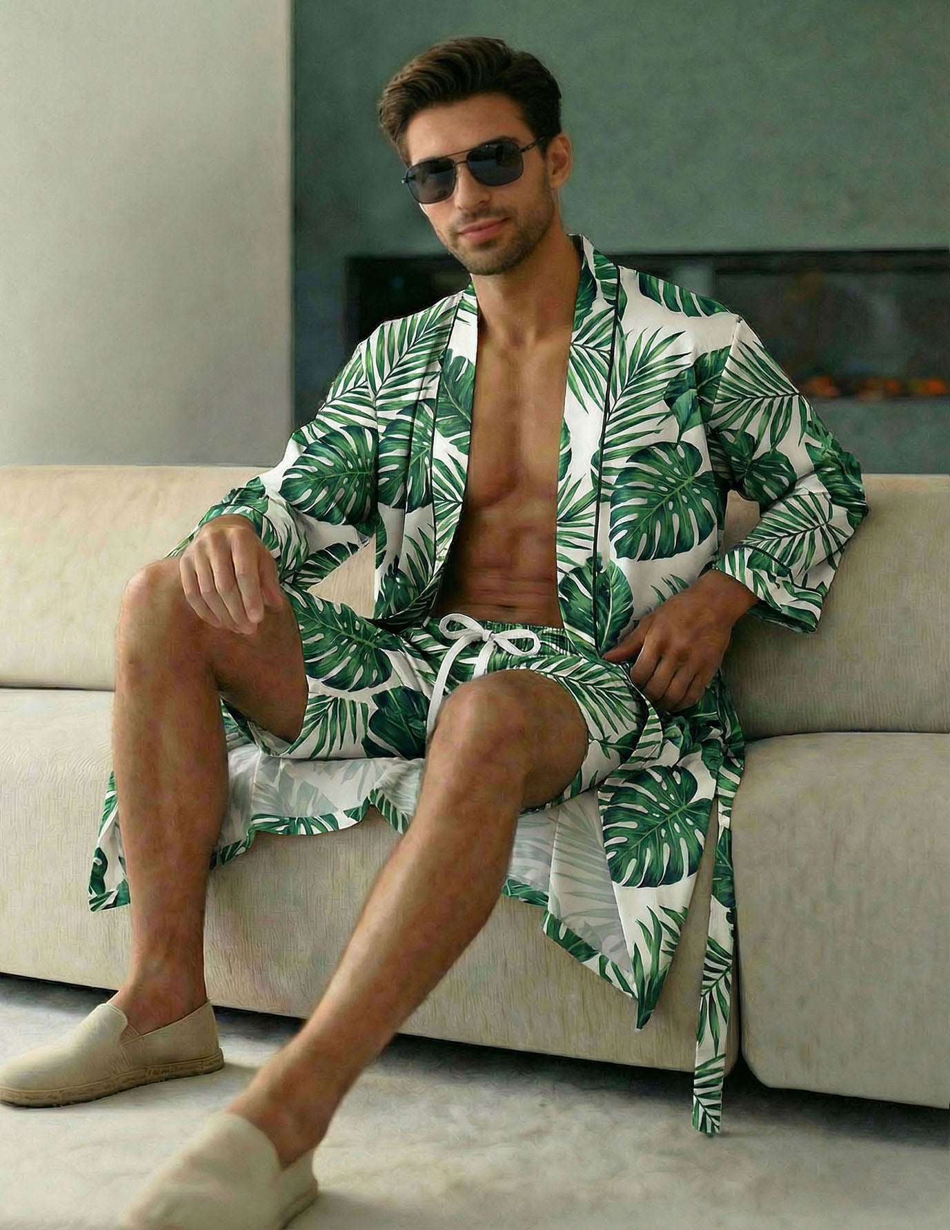 Luxurious Tropical Leaf Print Robe and Shorts Set for Men