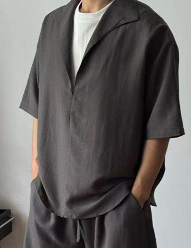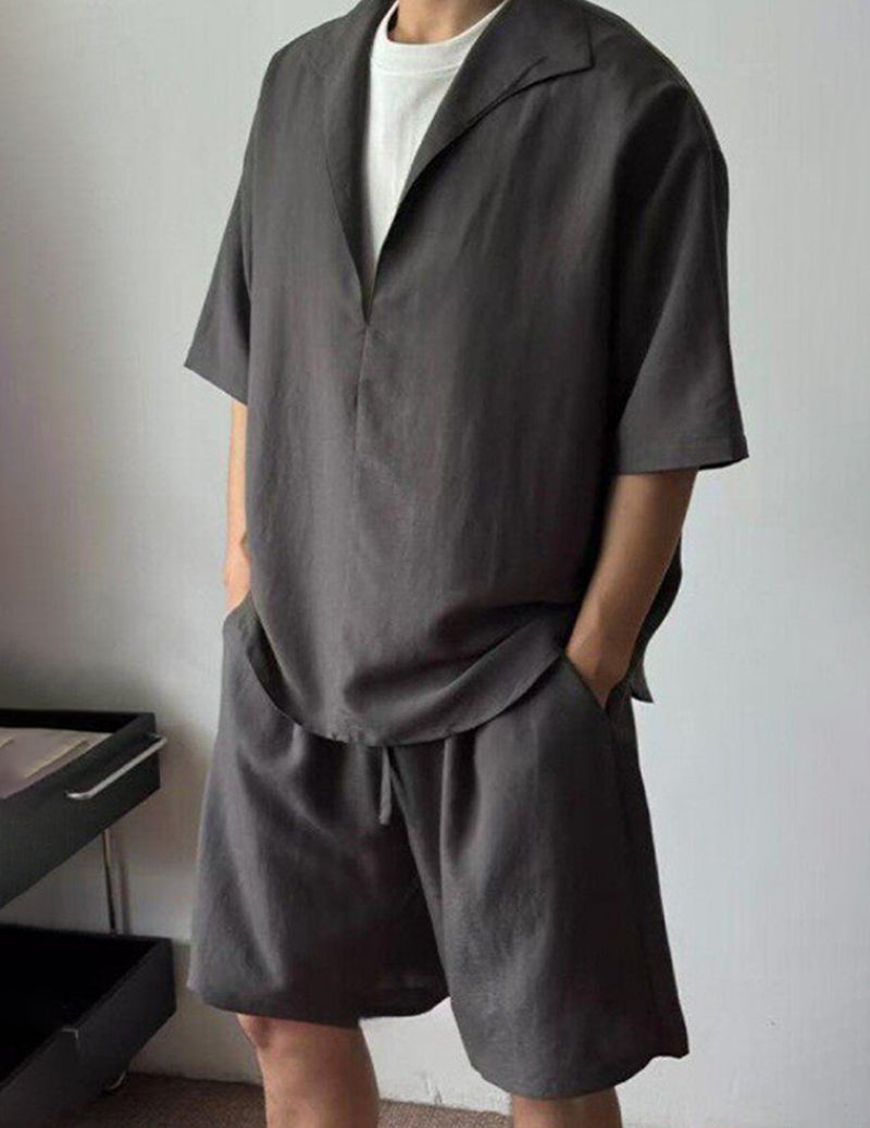 - Effortless minimal elegance. This relaxed two-piece set is crafted from soft, breathable linen-blend fabric. The short-sleeve shirt features a modern open collar and subtle V-neck opening, while the matching drawstring shorts offer a comfortable, laid-back fit with deep side pockets.